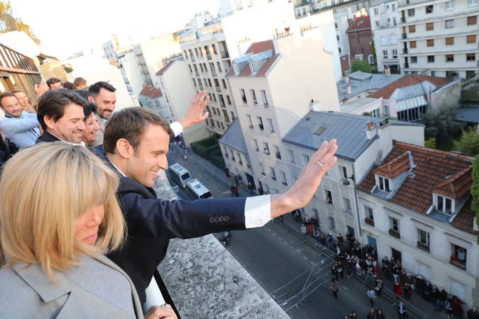 Szczesliwy Emmanuel Macron pozdrawia Francuzow