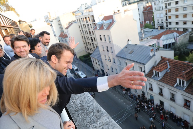 Szczesliwy Emmanuel Macron pozdrawia Francuzow