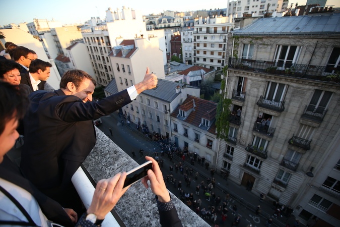 Szczesliwy Emmanuel Macron pozdrawia Francuzow