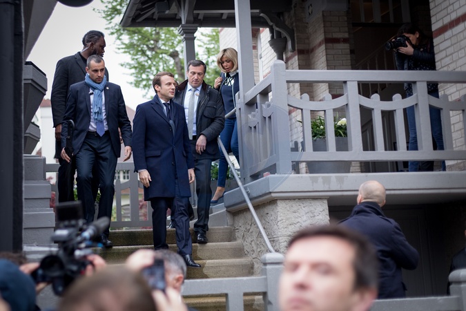Emmanuel Macron z zona wracaja z glosowania