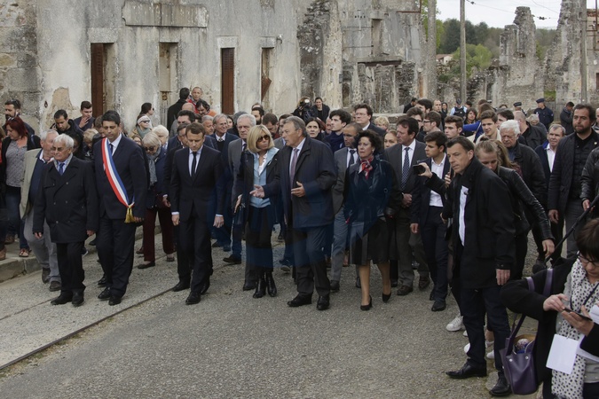 Emmannuel Macron z zona na spotkaniu w miasteczku dOradour-sur-Glane