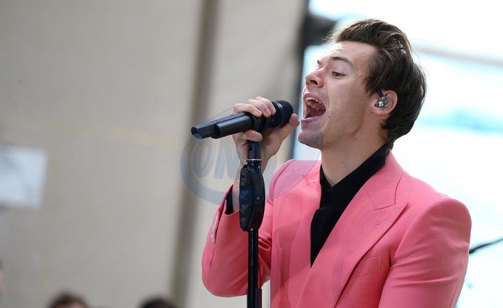 Harry Styles w rozowym garniturze na scenie