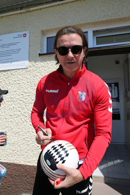Malgorzata Rozenek i Radoslaw Majdan z dziecmi na meczu w Busku Zdroju