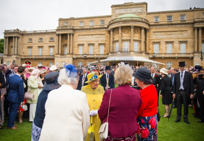 Krolowa Elzbieta II w zoltym plaszczyku i zoltym kapeluszu na garden party w Palacu Buckingham