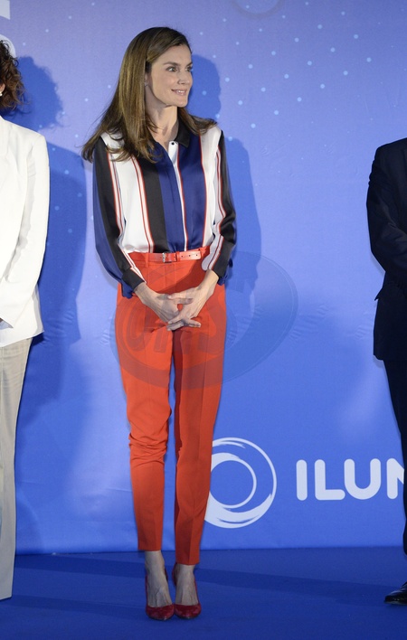 Krolowa Letizia w koszuli w pasy i w czerwonych spodniach