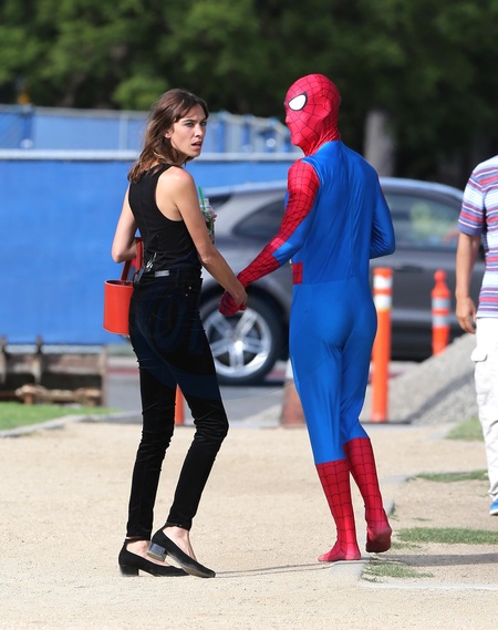 Alexa Chung przytula Spider Mana, plan zdjeciowy