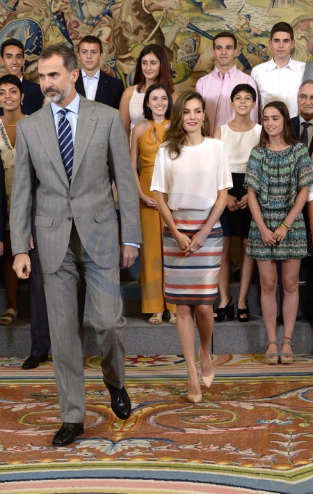 Letizia w spodnicy w paski i krol Filip w Palacu Zarzuela
