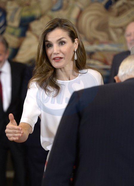 Letizia w spodnicy w paski i krol Filip w Palacu Zarzuela