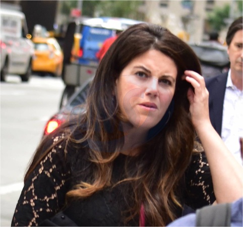 Monica Levinsky w czarnej, koronkowej sukience i w rozowej torebce