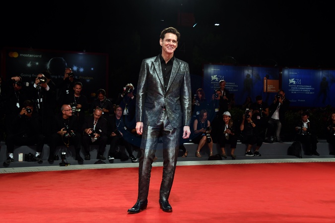 Wenecja - Jim Carrey w srebrnym garniturze na czerwonym dywanie