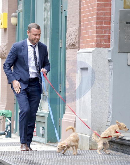 Liev Schreiber w garniturze z pieskami na spacerze