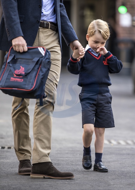 Ksiaze George z tata w drodze do szkoly