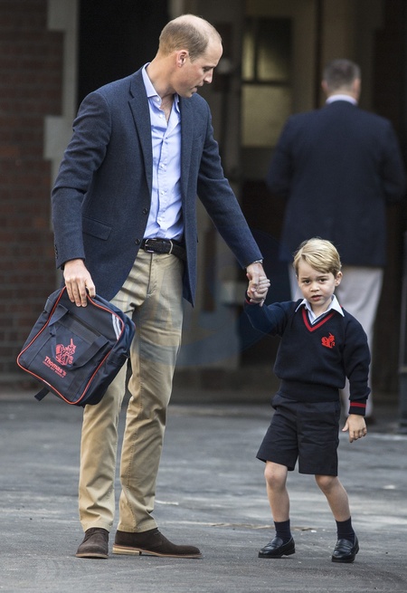 Ksiaze George z tata w drodze do szkoly