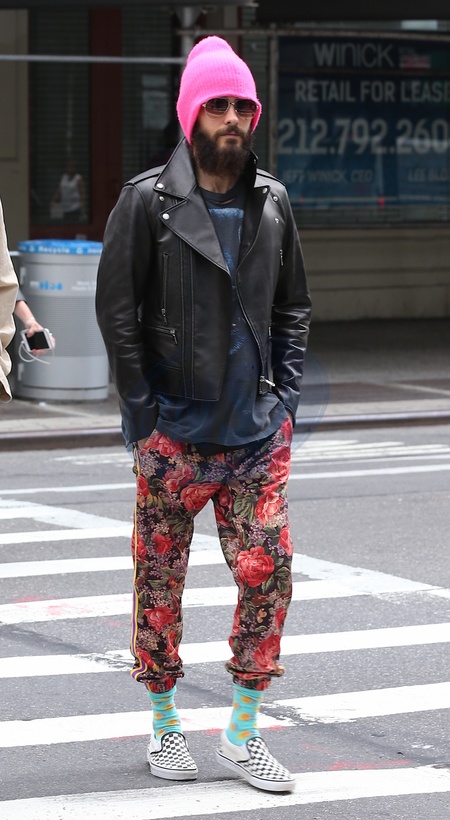 Jared Leto w rozowej czapie w spodniach w kwiatki
