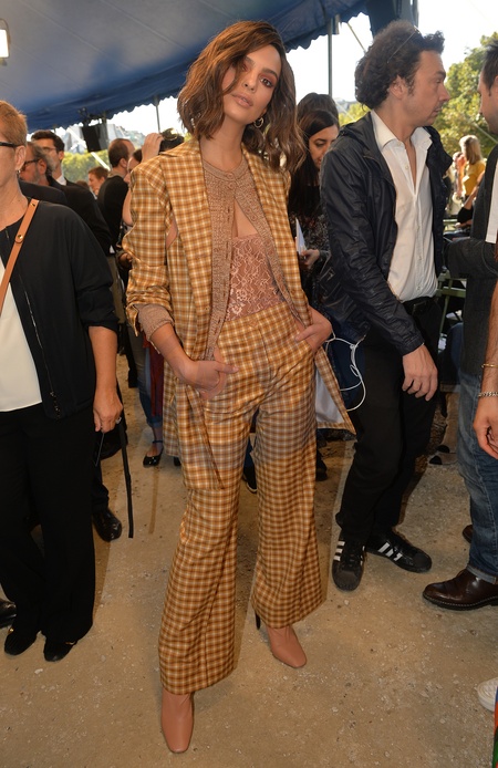 Emily Ratajkowski w garniturze w kratke na Paris Fashion Week