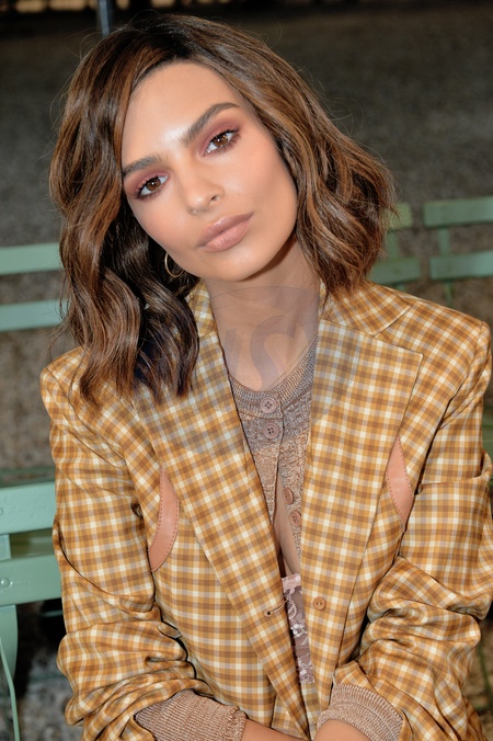 Emily Ratajkowski w garniturze w kratke na Paris Fashion Week