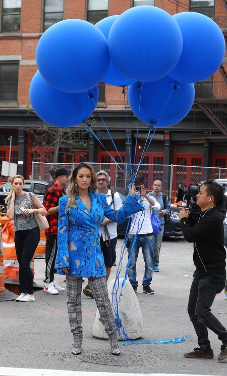 Rita Ora z niebieskimi balonami na planie teledysku