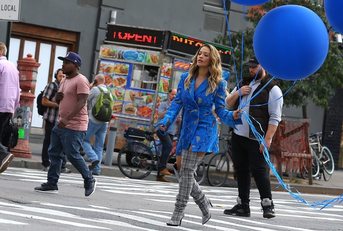 Rita Ora z niebieskimi balonami na planie teledysku