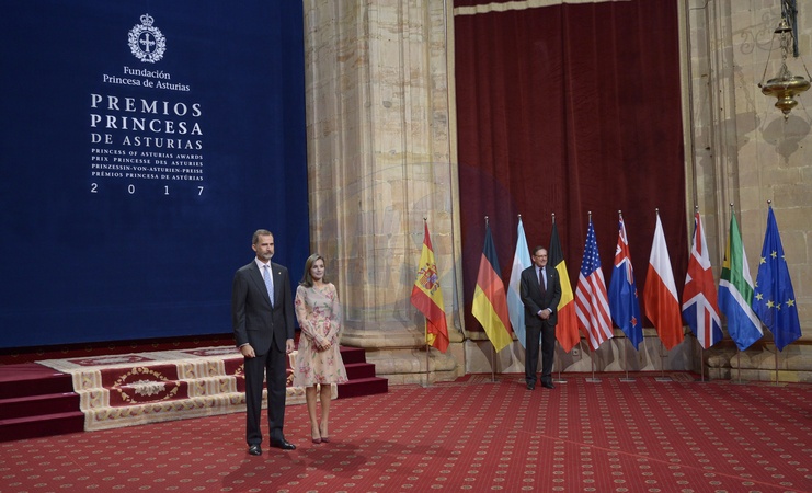 Krolowa Letizia w sukience Caroliny Herrery i krol Filip na ceremonii wreczenia nagrod Ksiezniczki Asturii
