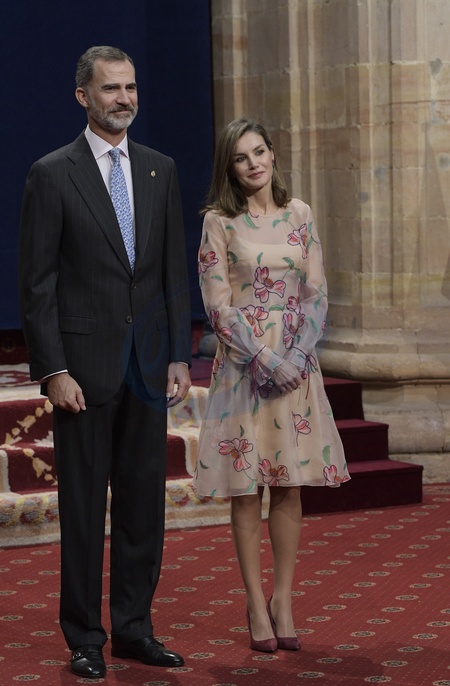 Krolowa Letizia w sukience Caroliny Herrery i krol Filip na ceremonii wreczenia nagrod Ksiezniczki Asturii