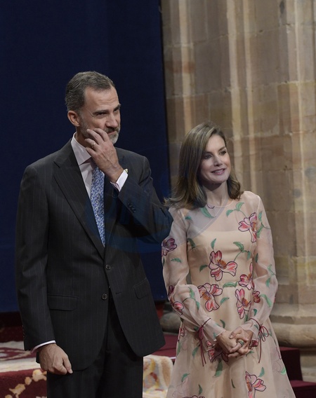 Krolowa Letizia w sukience Caroliny Herrery i krol Filip na ceremonii wreczenia nagrod Ksiezniczki Asturii