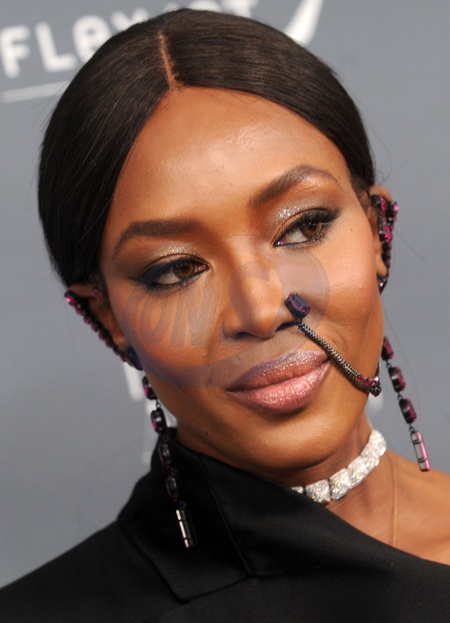 Naomi Campbell z dziwna bizuteria na twarzy