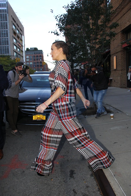 Kate Hudson w kraciastych spodniach i bluzce jak z koca