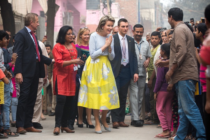Krolowa Matylda w zoltej spodnicy na ulicach New Delhi
