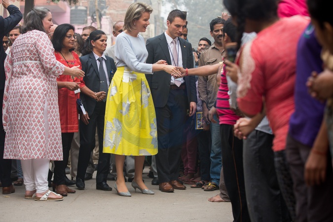 Krolowa Matylda w zoltej spodnicy na ulicach New Delhi