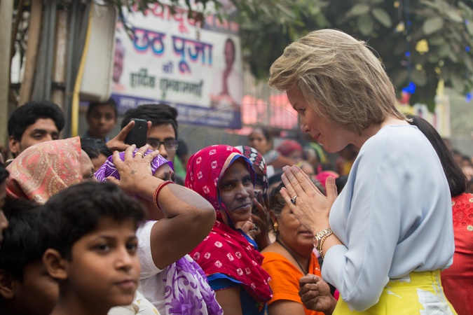 Krolowa Matylda w zoltej spodnicy na ulicach New Delhi