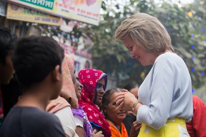 Krolowa Matylda w zoltej spodnicy na ulicach New Delhi
