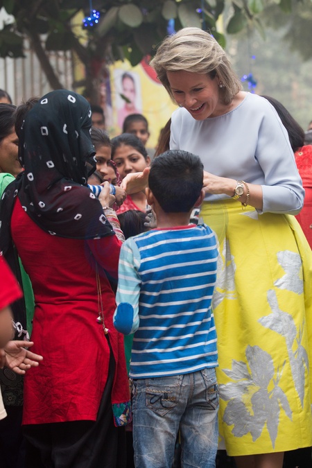 Krolowa Matylda w zoltej spodnicy na ulicach New Delhi