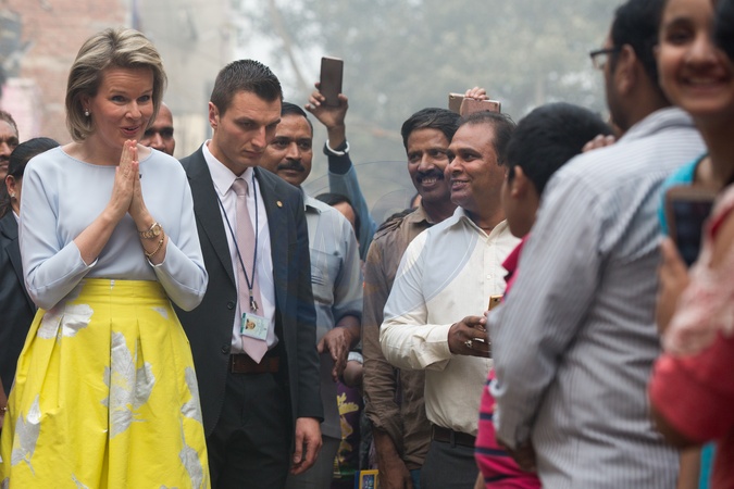 Krolowa Matylda w zoltej spodnicy na ulicach New Delhi