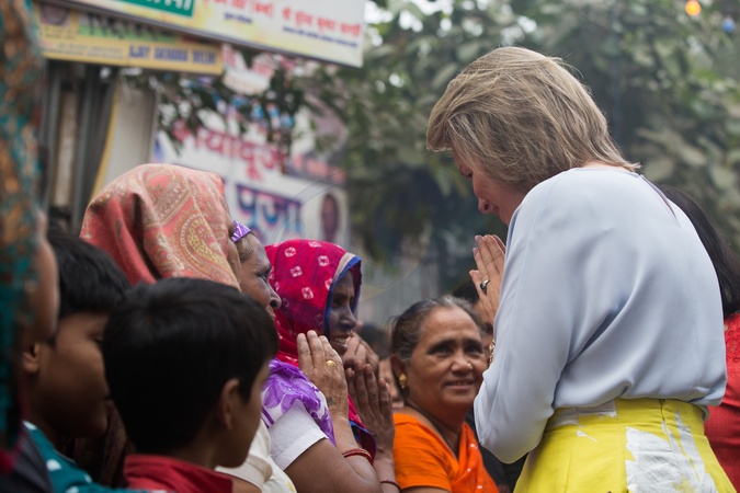 Krolowa Matylda w zoltej spodnicy na ulicach New Delhi