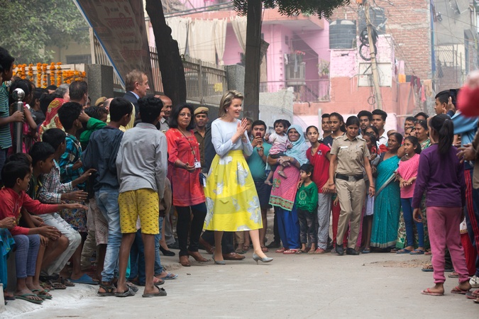 Krolowa Matylda w zoltej spodnicy na ulicach New Delhi