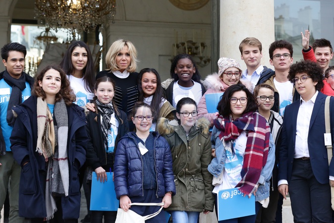 Brigitte Macron i Emmanuel Macron spotkali sie z dziecmi okazji dnia praw dziecka
