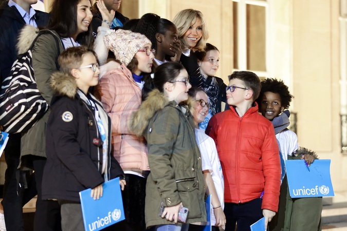 Brigitte Macron i Emmanuel Macron spotkali sie z dziecmi okazji dnia praw dziecka