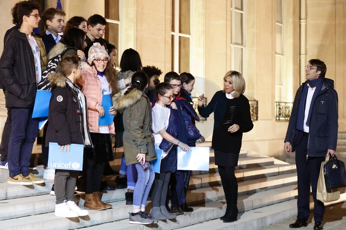 Brigitte Macron i Emmanuel Macron spotkali sie z dziecmi okazji dnia praw dziecka