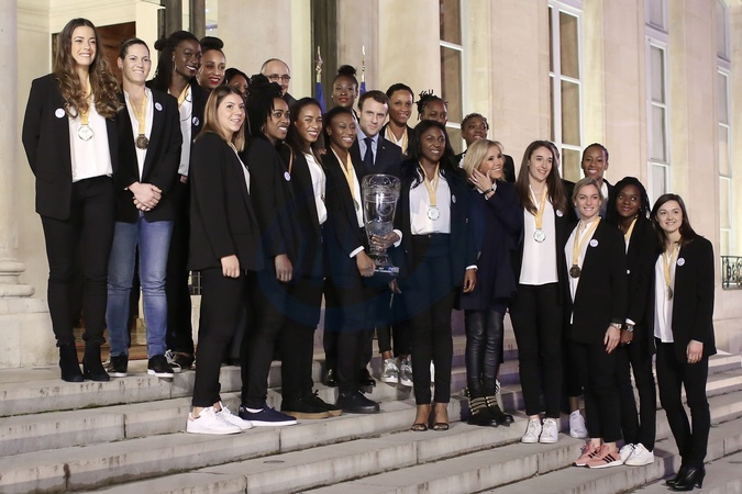 Brigitte Macron i Emmanuel Macron spotkali sie z zespolem pilkarek recznych