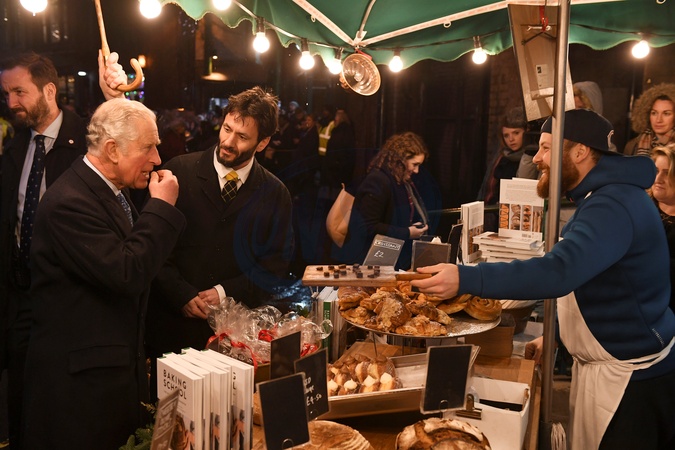 Ksiezna Camilla i ksiaze Karol przy produkcji ciasteczek