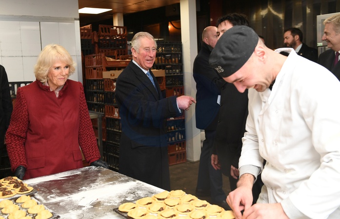 Ksiezna Camilla i ksiaze Karol przy produkcji ciasteczek