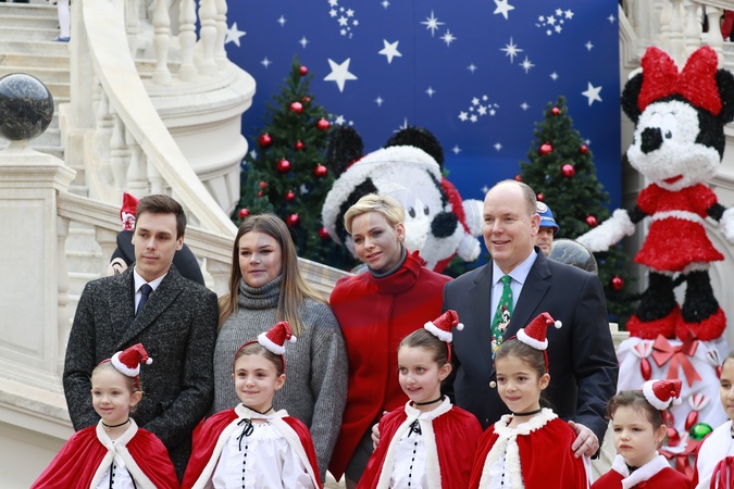 Ksiaze Albert w czapce Mikolaja i ksiezna Charlene w czerwonym plaszczyku