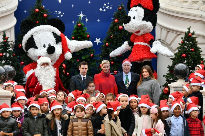 Ksiaze Albert w czapce Mikolaja i ksiezna Charlene w czerwonym plaszczyku