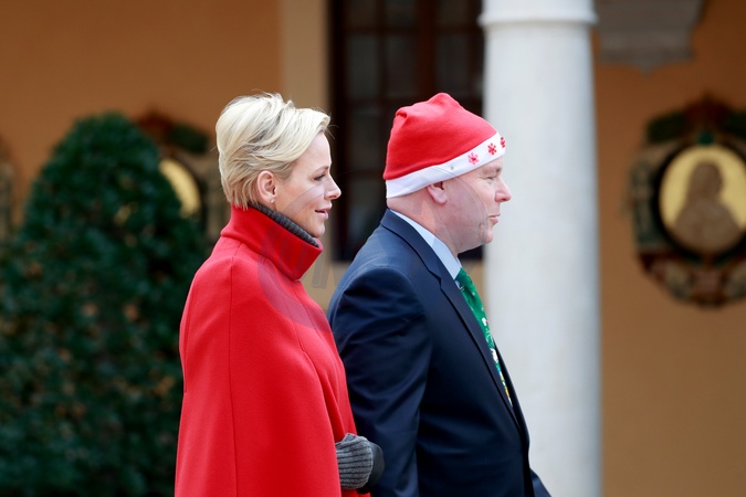 Ksiaze Albert w czapce Mikolaja i ksiezna Charlene w czerwonym plaszczyku