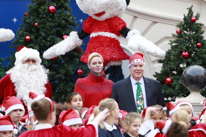 Ksiaze Albert w czapce Mikolaja i ksiezna Charlene w czerwonym plaszczyku