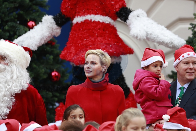 Ksiaze Albert w czapce Mikolaja i ksiezna Charlene w czerwonym plaszczyku