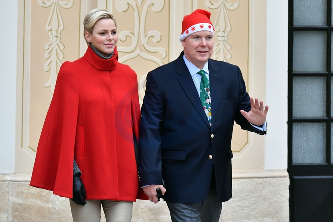 Ksiaze Albert w czapce Mikolaja i ksiezna Charlene w czerwonym plaszczyku