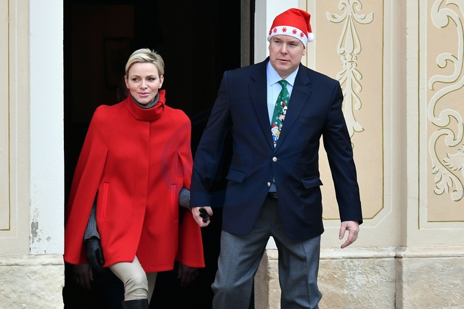 Ksiaze Albert w czapce Mikolaja i ksiezna Charlene w czerwonym plaszczyku