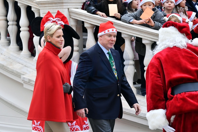 Ksiaze Albert w czapce Mikolaja i ksiezna Charlene w czerwonym plaszczyku