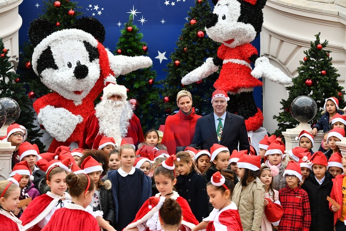 Ksiaze Albert w czapce Mikolaja i ksiezna Charlene w czerwonym plaszczyku